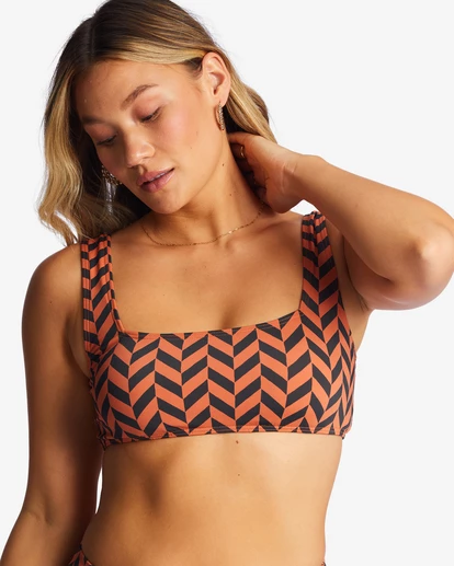 Made of recycled Peach Stretch nylon, this printed bikini top has a sporty pullover design with fixed straps and coverage you can count on in the waves.