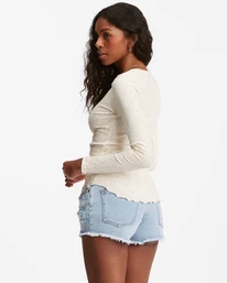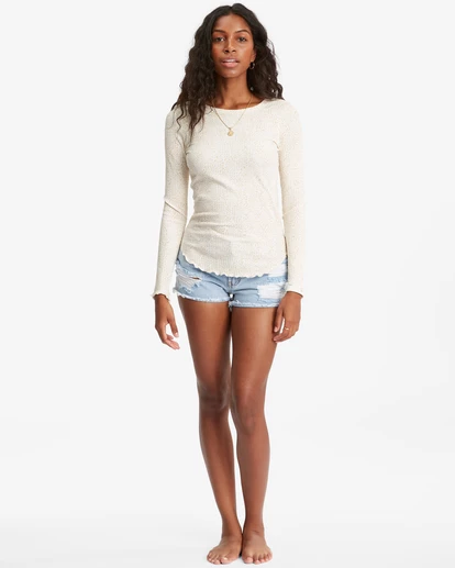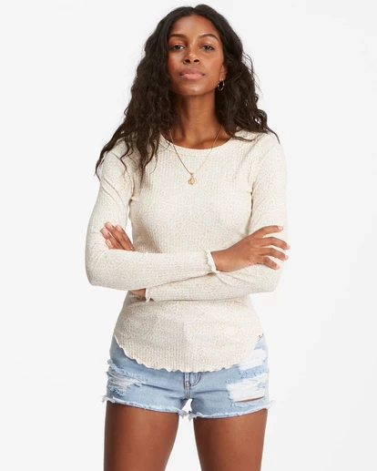 Match your outfit with your easy-going attitude with the Fine By Me Top. The perfect base layer to carry your style through the seasons, this fitted women’s long sleeve is made in a ribbed knit fabric with baby merrow ruffles at the hem. An all-over print elevates this everyday staple.