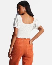 Made of pointelle cotton-blend fabric, this floral top has all the pretty details: puff sleeves, a sweetheart neckline, and a smocked waist to perfectly hug your figure.