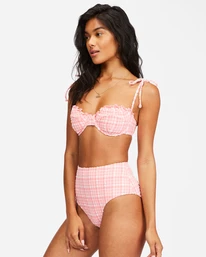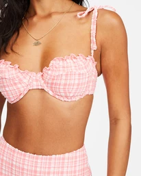 Fulfill your fem fantasies in the Pink Tide Ruffle Underwire bikini top. A pretty pink twist on plaid, this women’s bikini top features a woven yarn-dyed pattern made with recycled stretch fabric. The medium coverage design is styled with top ruffles and sweet shoulder ties. Internal underwire delivers ample shape and support for a range of cup sizes. Absolutely dreamy!