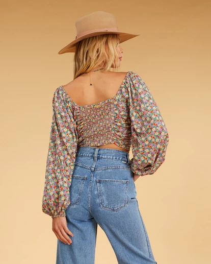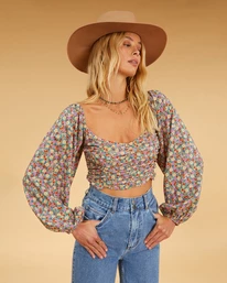 A boho beauty with the perfect touch of coastal cool, the Salty Blonde Free Love crop top features a playful floral print on eco-responsible FCS Certified viscose. This fitted top features long blouson sleeves and a gathering effect at the bust. (Hot tip: there’s even a matching skirt.)