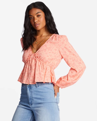 The Time Goes By top combines a long blouson sleeve with a plunging V-neckline and a ruffled hem. Crafted with airy viscose to give it a lightweight and breathable feel, this cropped blouse from the Sol Chasin collection is styled with a waist-accentuating drawcord that ties at the front.